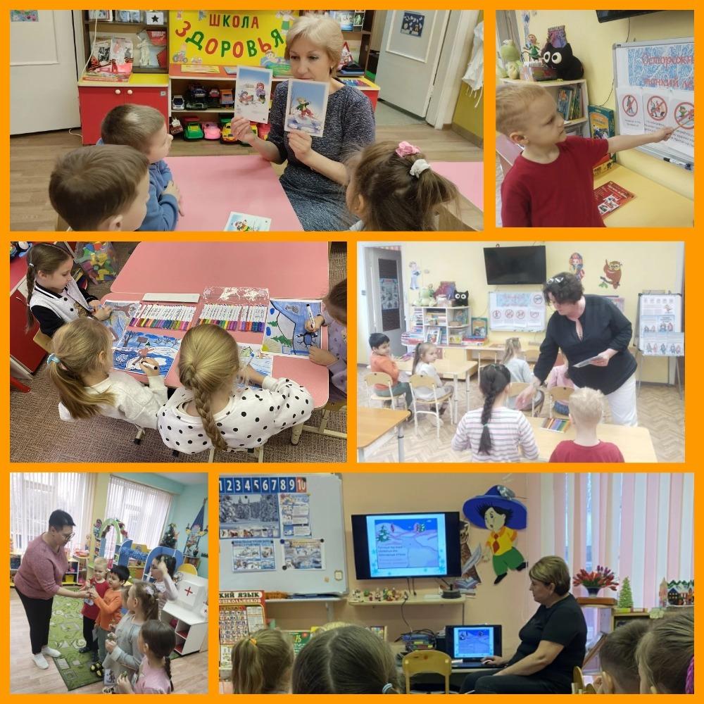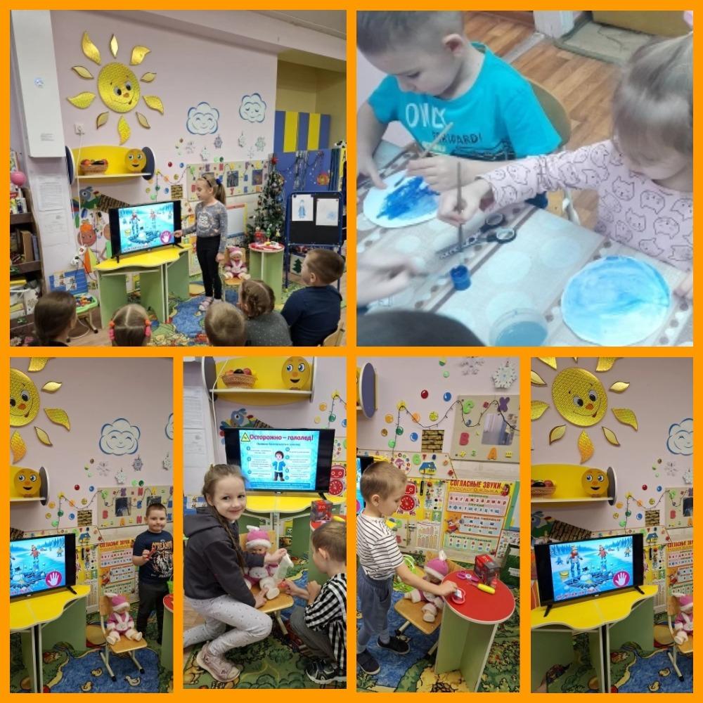 рассматривали иллюстрации, создавали рисунки на тему «Осторожно, тонкий лёд», а